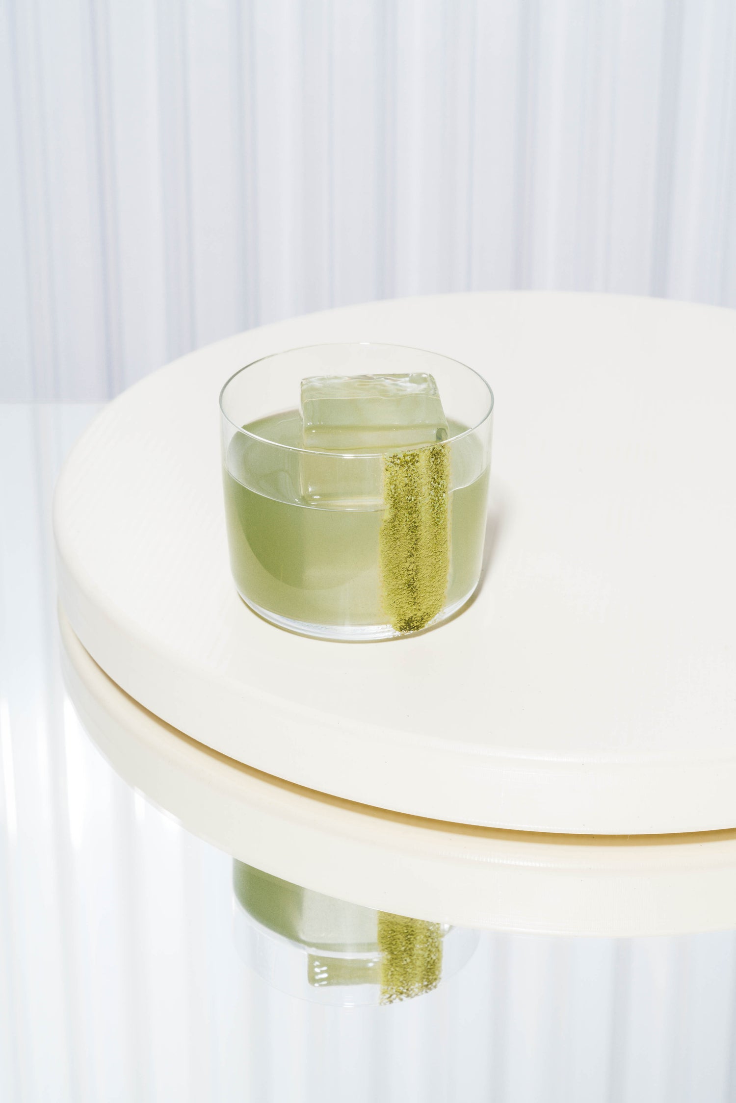 Make a dash of lime juice on the outside of the glass and sprinkle with matcha powder.