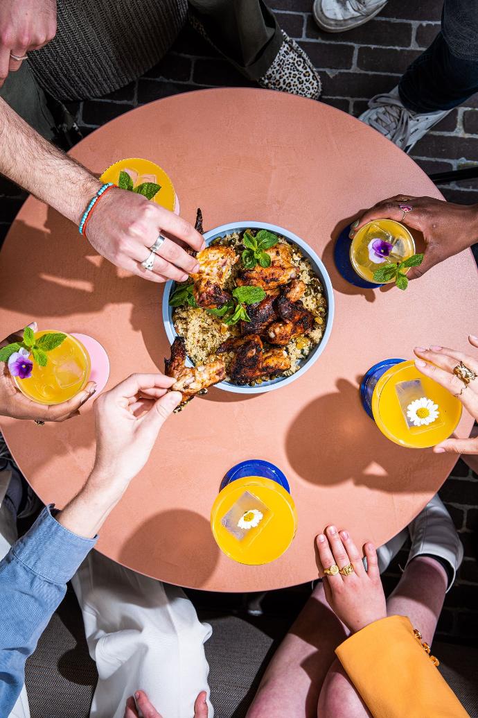 Divide the chickenwings among the couscous salad and top with grilled pistachios, pomegranate and some freshly chopped mint and coriander.