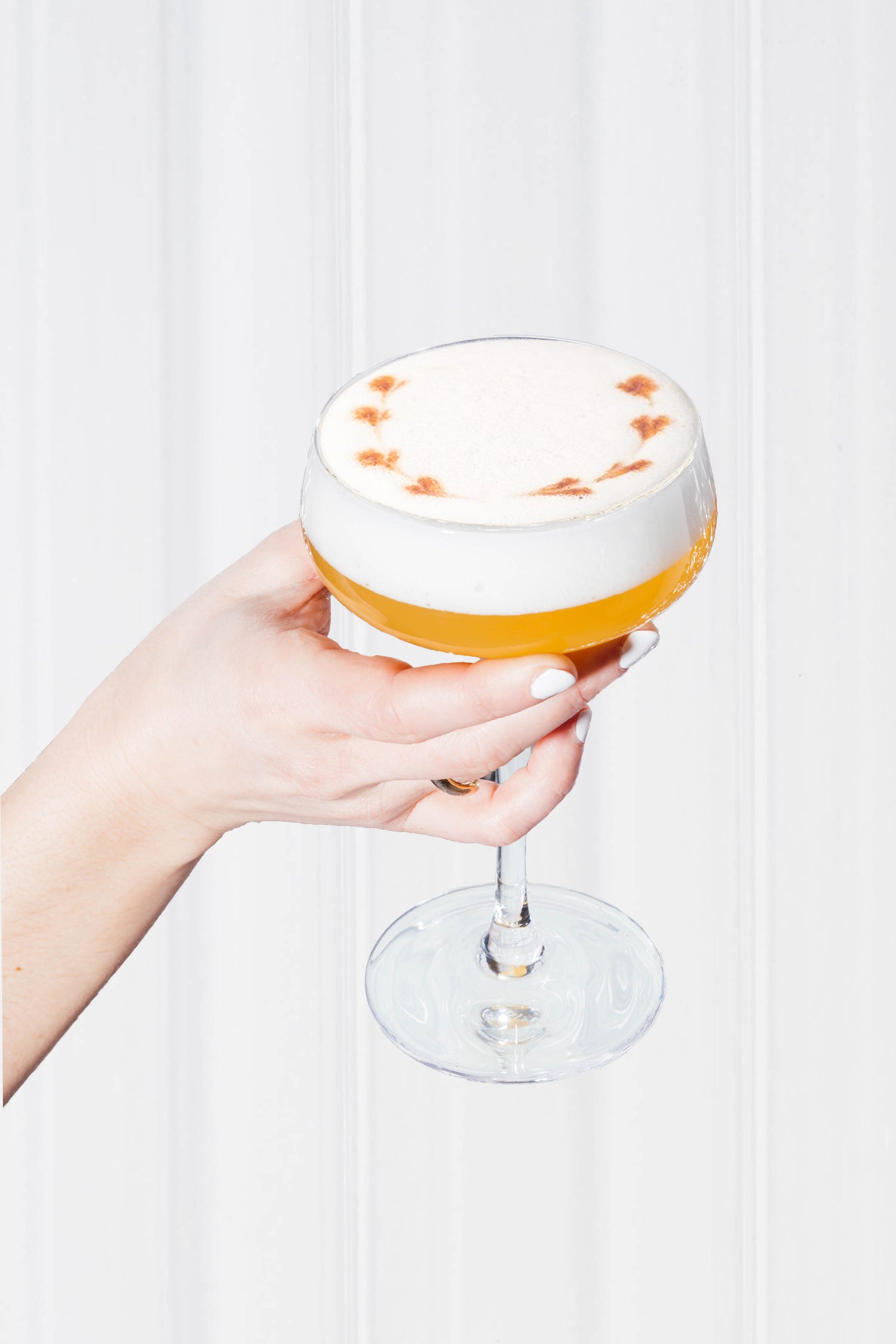To obtain a beautiful foam layer, we're going to shake it. Add 3cl of aquafaba to 150ml of the mocktail and shake it with 4 ice cubes. Pour it into your glass using a strainer so that the ice doesn't end up in your mocktail. You don't add any more ice to the mocktail. Finally, garnish your mocktail with a red basil leaf.
