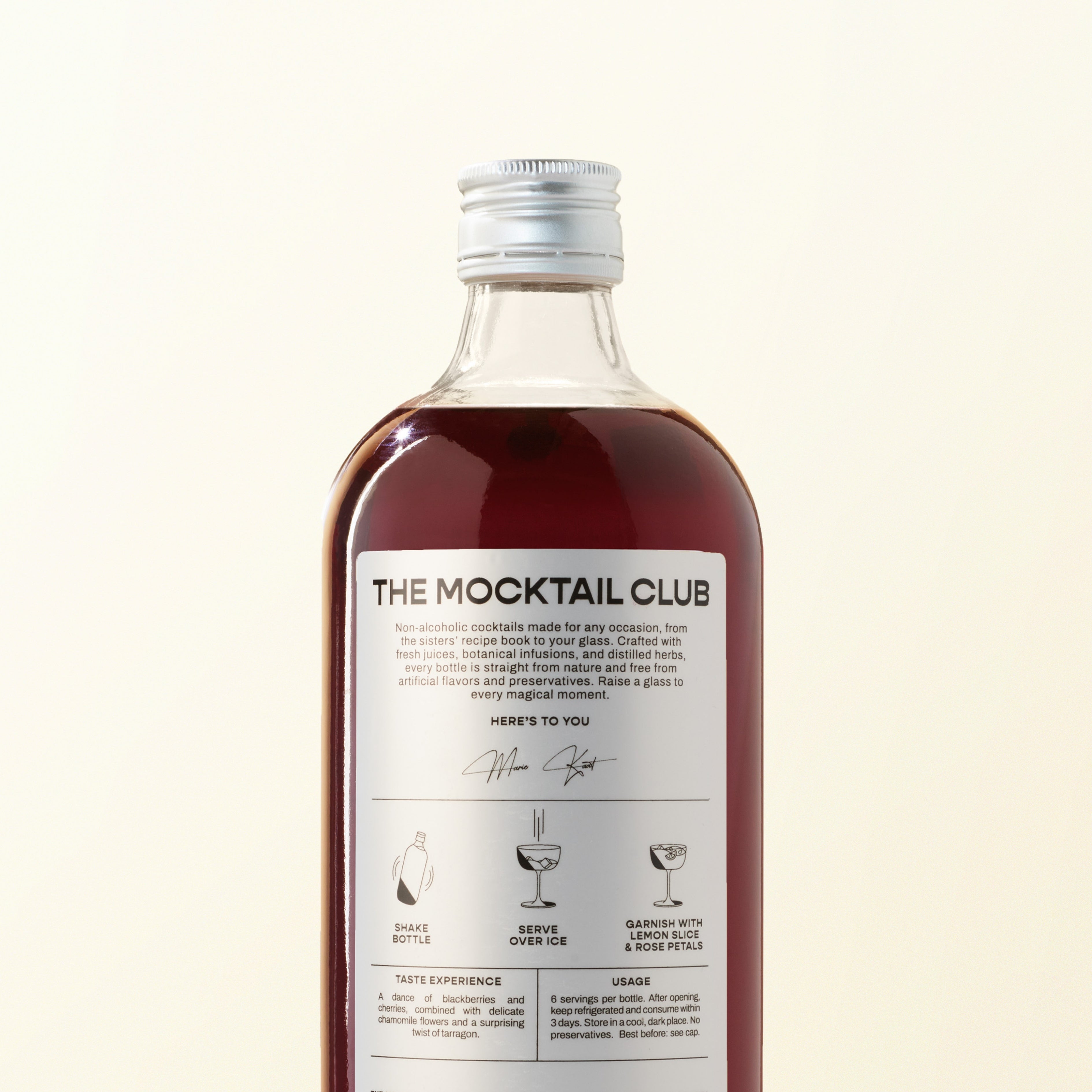 At The Mocktail Club, we craft bold, unique flavors using only refined, natural ingredients. In Berry Bash, you’ll experience juicy blackberries and sweet cherries, perfectly balanced with the delicate floral notes of chamomile and a surprising twist of tarragon. No artificial colors, preservatives, or shortcuts. Just pure, delicious refreshment in every sip.